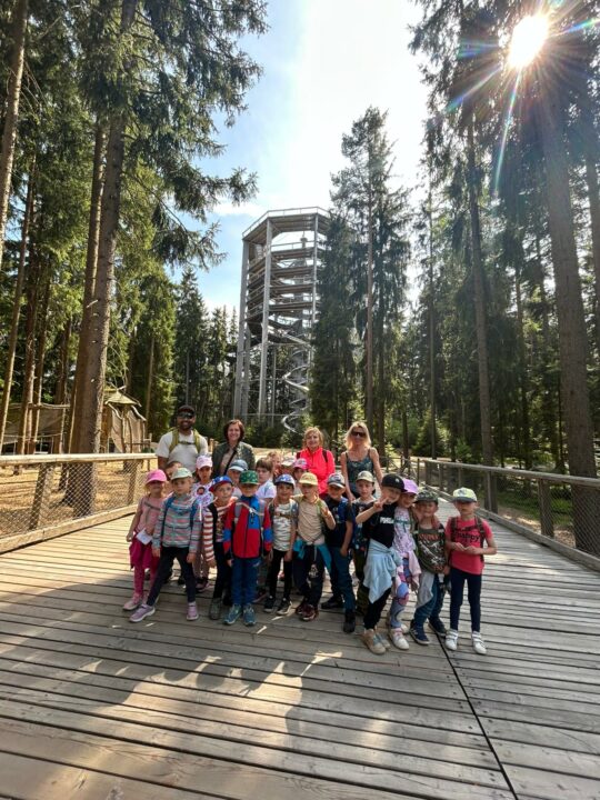 Stezka korunami stromů byla zážitek, na který se nezapomíná – obdiv patří kolegyním, které s dětmi vystoupaly až na vrchol. Mužská část výpravy zůstala pod poslední věží – prý kvůli dětem. (Dodnes není jasné, kdo se bál víc.)